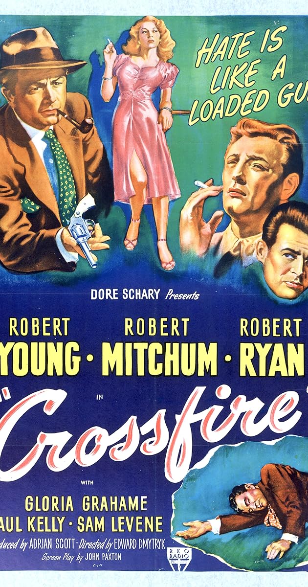 Unlike most film noir, Edward Dmytryk's Crossfire, adapted from a novel by Richard Brooks, is not nearly as concerned with its murder mystery, which, at first sight, might seem superficially formulaic to the casual viewer, as it is with the complex motives of its characters and the oppressive ambience of its accurately rendered post-WWII setting, evoking feelings of disorientation, loneliness and entrapment. Under its classic noir exterior, it is about hardened and aloof veterans' struggle with postwar reintegration, utterly unable or unwilling to put their traumatic experiences behind them, and about their desperate attempt to redefine their goals. For those who define themselves by who their enemies are, such as hateful loner Montgomery (the brilliant Robert Ryan), this necessitates establishing a new one, a role filled here by Jewish intellectual Joseph Samuels (Sam Levene), who becomes the regrettable victim of a senseless hate crime.